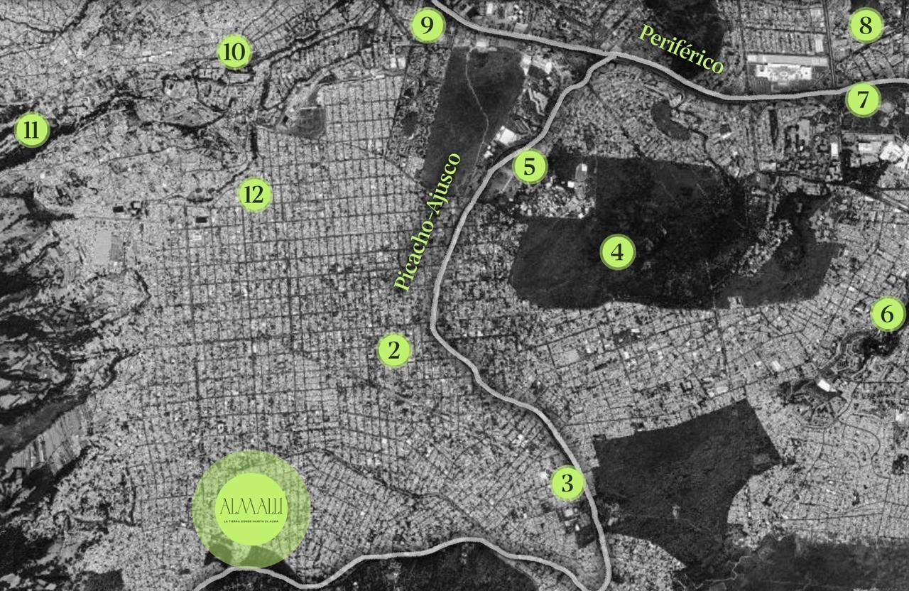 El Proyecto se ubica en el corazón del Ajusco Medio, una zona que combina la tranquilidad de la naturaleza con la cercanía a los principales puntos del sur de la ciudad. Gracias a su conexión estratégica, en condiciones de tráfico matutino estarás aproximadamente a: